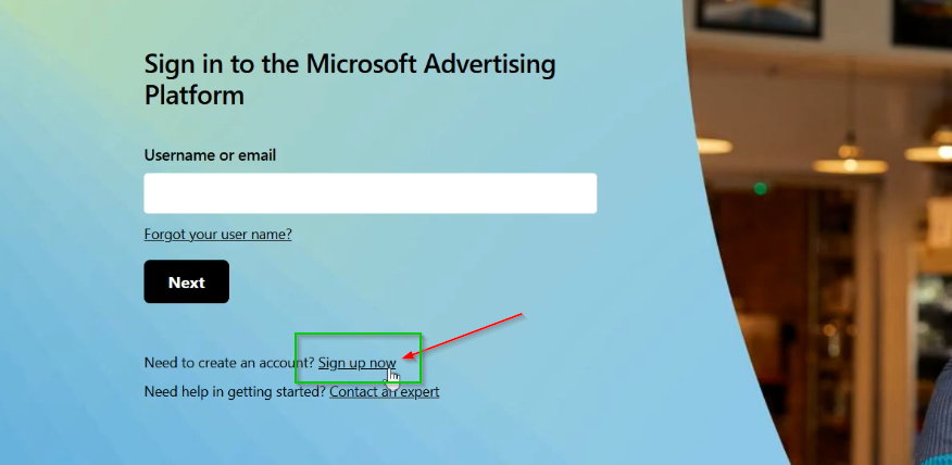 Przejdź na stronę ads.microsoft.com i kliknij przycisk „Sign up now” (Zarejestruj się teraz).