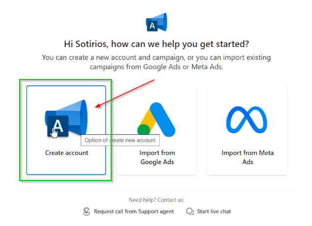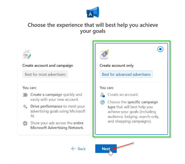 - Porada: Nawet jeśli masz gotowe kampanie gdzie indziej, zaleca się wybór opcji utworzenia konta od podstaw. Pozwala to na lepsze poznanie specyfiki Bing Ads przed kopiowaniem ustawień z innych systemów.