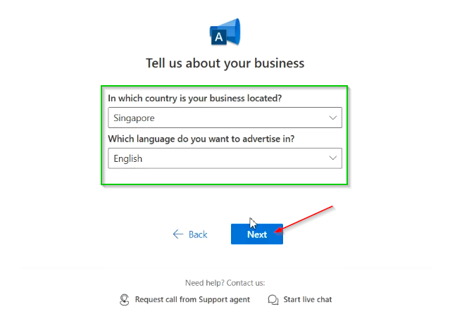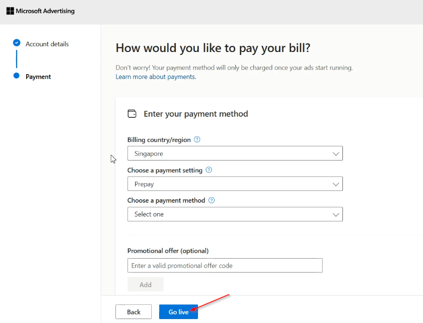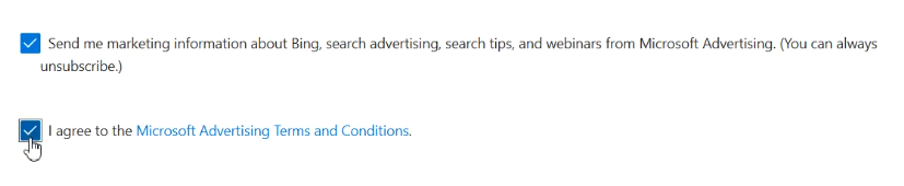 Na samym dole zaznacz akceptację regulaminu Microsoft Advertising i kliknij przycisk kończący rejestrację (np. „Go live” lub „Create”). Twoje konto jest teraz aktywne i gotowe do konfiguracji pierwszej kampanii.
